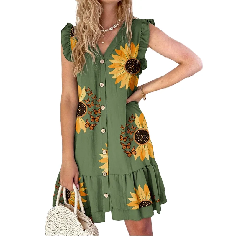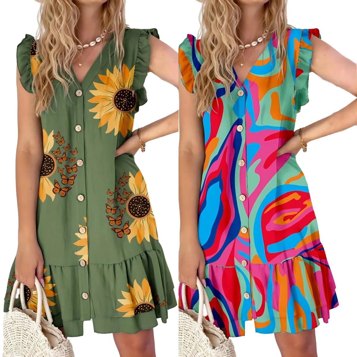Lady's Summer Floral Printed Boho Dress Casual Short Sleeve V-Neck Skirt Lapel Button Natural Waistline Europe Vacation Style